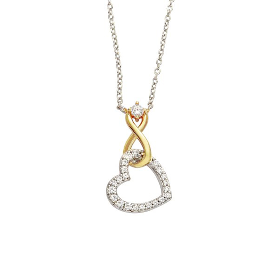 Feines Silbercollier 925/000 mit einem funkelnden Herzanhänger, welcher mit Zirkonia besetzt ist sowie einer vergoldeten Unendlichkeitsschleife.
