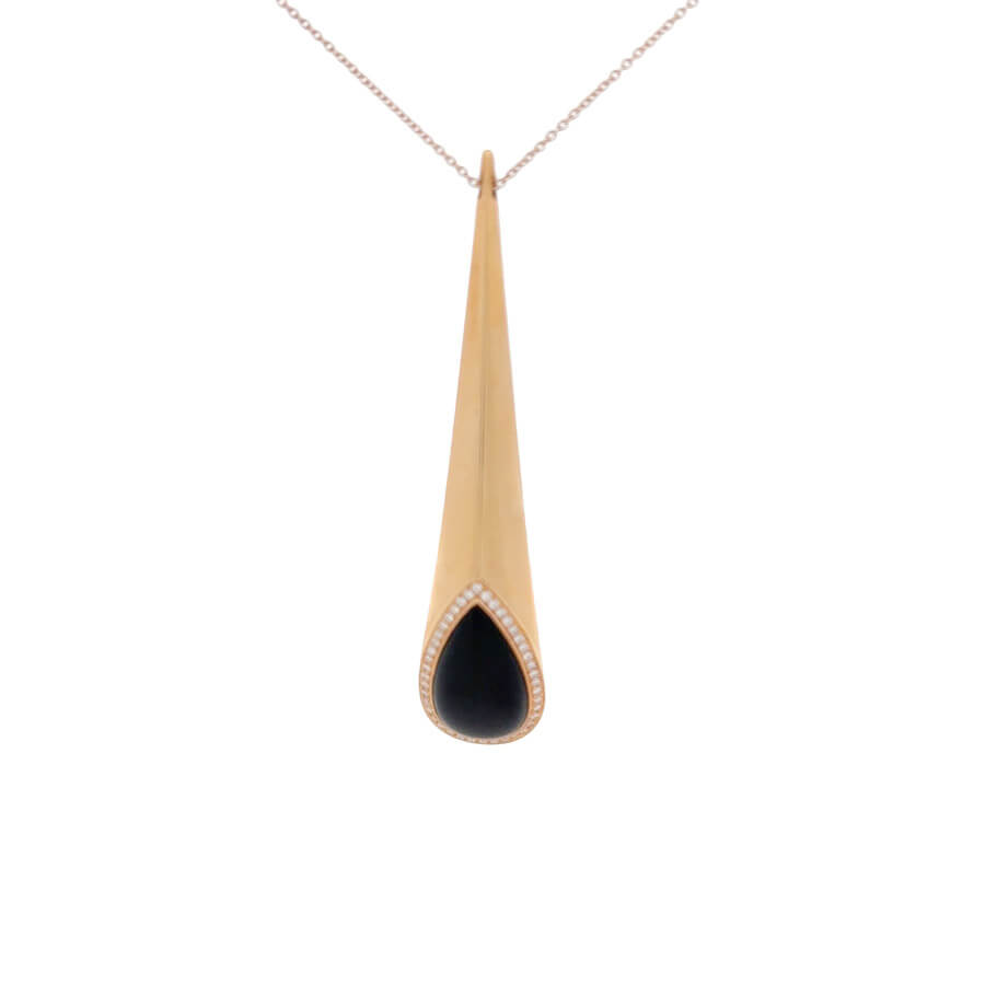 Dieser elegante Anhänger, gefertigt aus warmem Roségold, präsentiert einen faszinierenden, tropfenförmigen Onyx im Cabochon-Schliff umrahmt von funkelnden Diamanten. Die Kette, ebenfalls aus Roségold, ergänzt das Design perfekt. Ein zeitloses Schmuckstück, das sowohl klassische Eleganz als auch modernen Stil vereint.