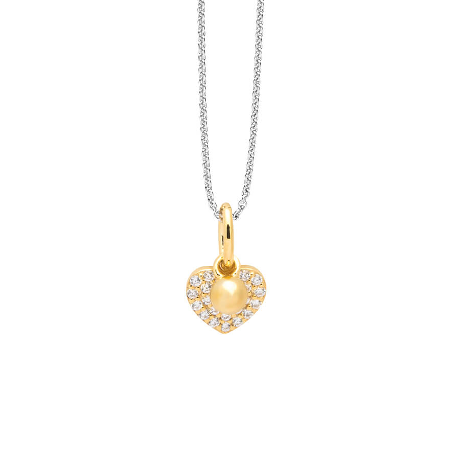 Zartes Collier aus rhodiniertem Silber mit einem Herzanhänger in gold der mit Zirkonia besetzt ist. Dazu schimmert noch eine Kugel in poliertem Silber.