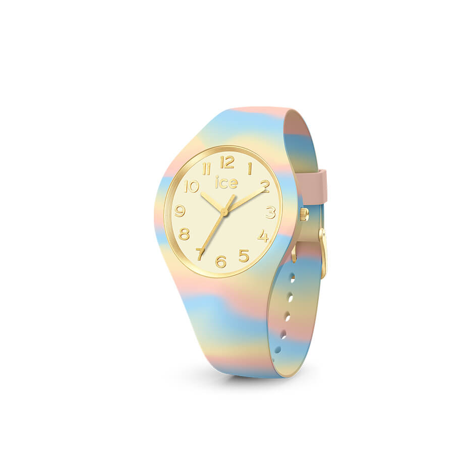 Stylisch – im Stil der 70er Jahre, die pastel blue ICE tie and dye! Diese Uhr in Pastellfarben ist das perfekte Accessoire an Ihrem Handgelenk. Die Zifferkeile und Zeiger sind in gold gehalten, das Zifferblatt schimmert in einem zarten mint Ton.