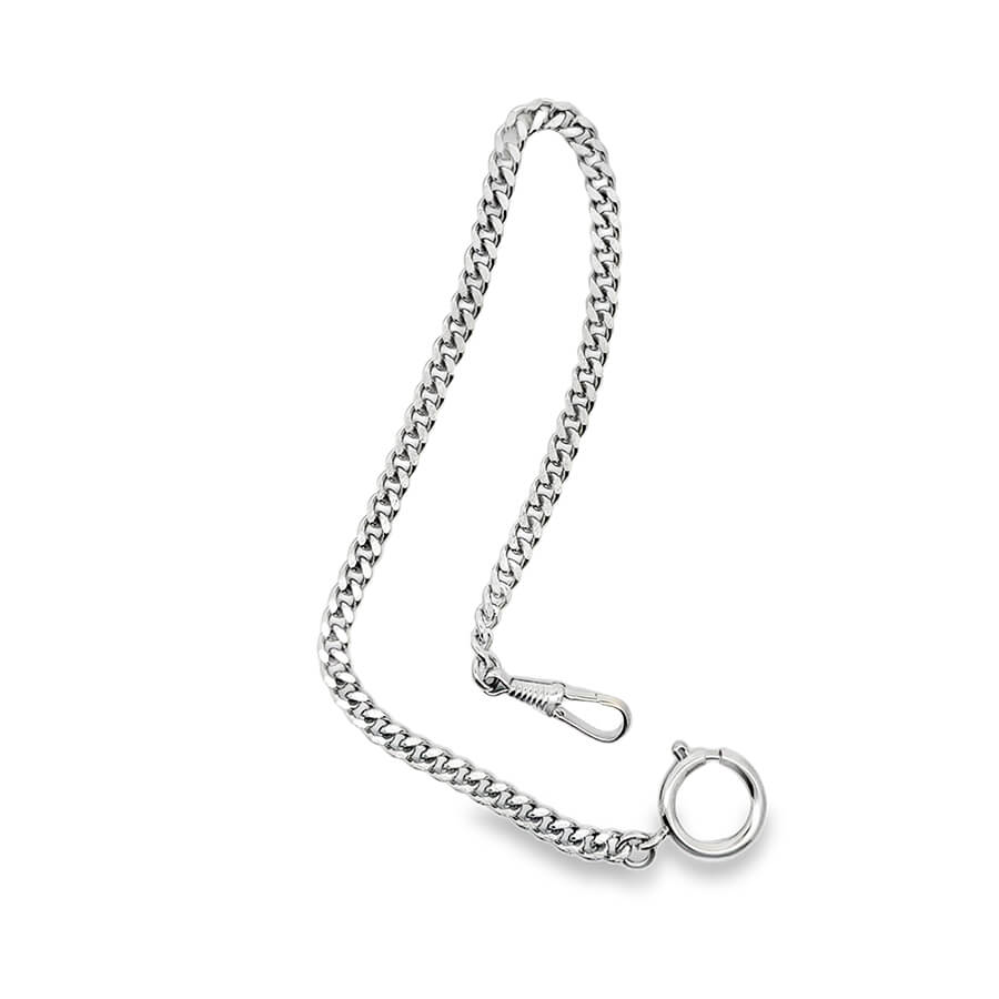 Diese Massive Metall Taschenuhrkette ist 5mm breit vernickelt mit Karabiner und Federring passend zu vielen silberfarbigen Taschenuhren aus unserem Angebot. Die Kette hat an dem einen Ende einen Karabiner zum Einhängen der Taschenuhr, am gegenüber liegenden Ende ist ein großer Federring. Damit wird die vernickelte Taschenuhrkette an Ihrer Gürtelschlaufe eingeklinkt. Das Rundpanzer Kettenmuster ist schön glatt und hat eine Gesamtbreite von 5mm. Schöne elegante Taschenuhrkette.