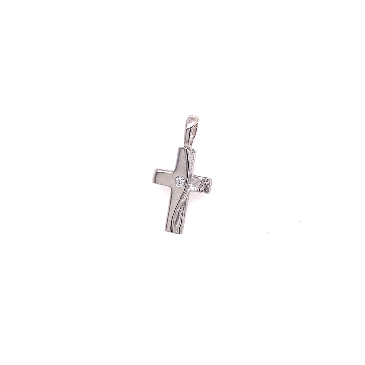 Dieser Anhänger in Form eines schlichten Kreuzes aus 14kt. Weißgold.