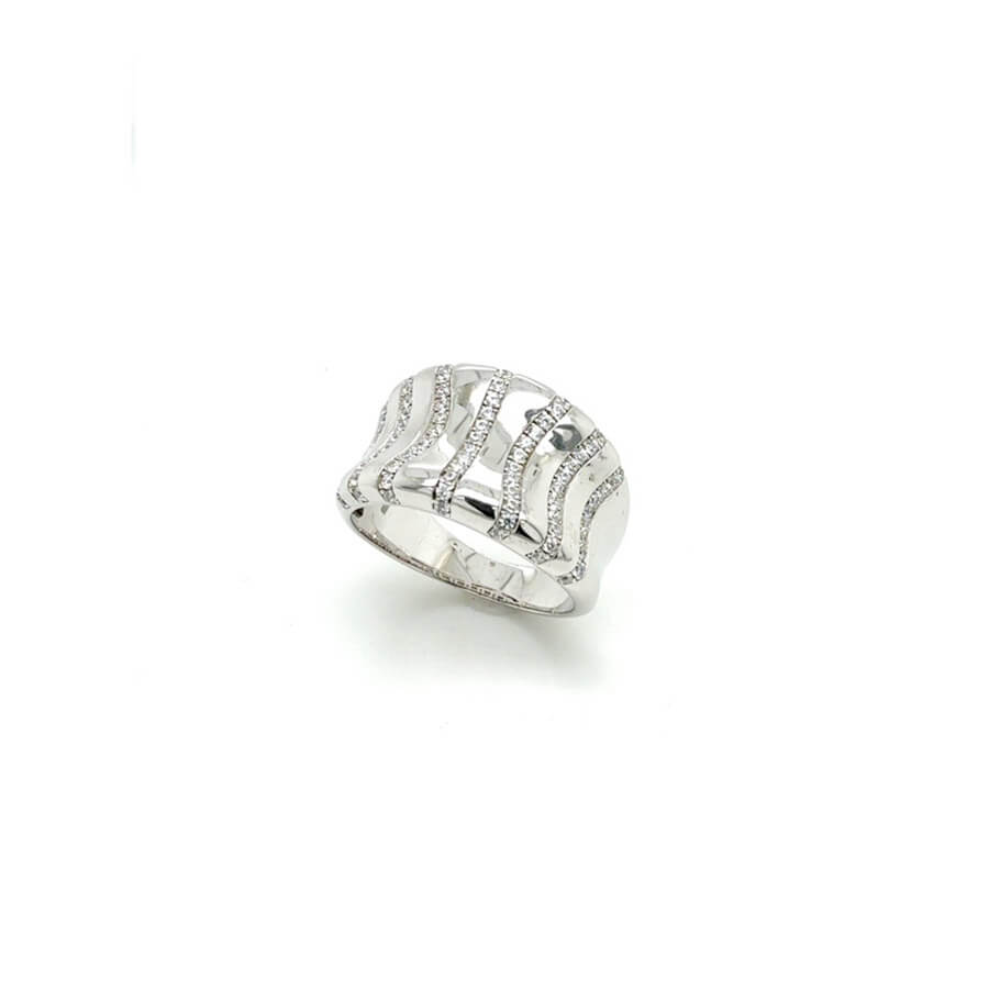 Das auffallende, geschwungene Schmuckstück besteht aus Silber 925/000 mit funkelnden Zirkoniastreifen.