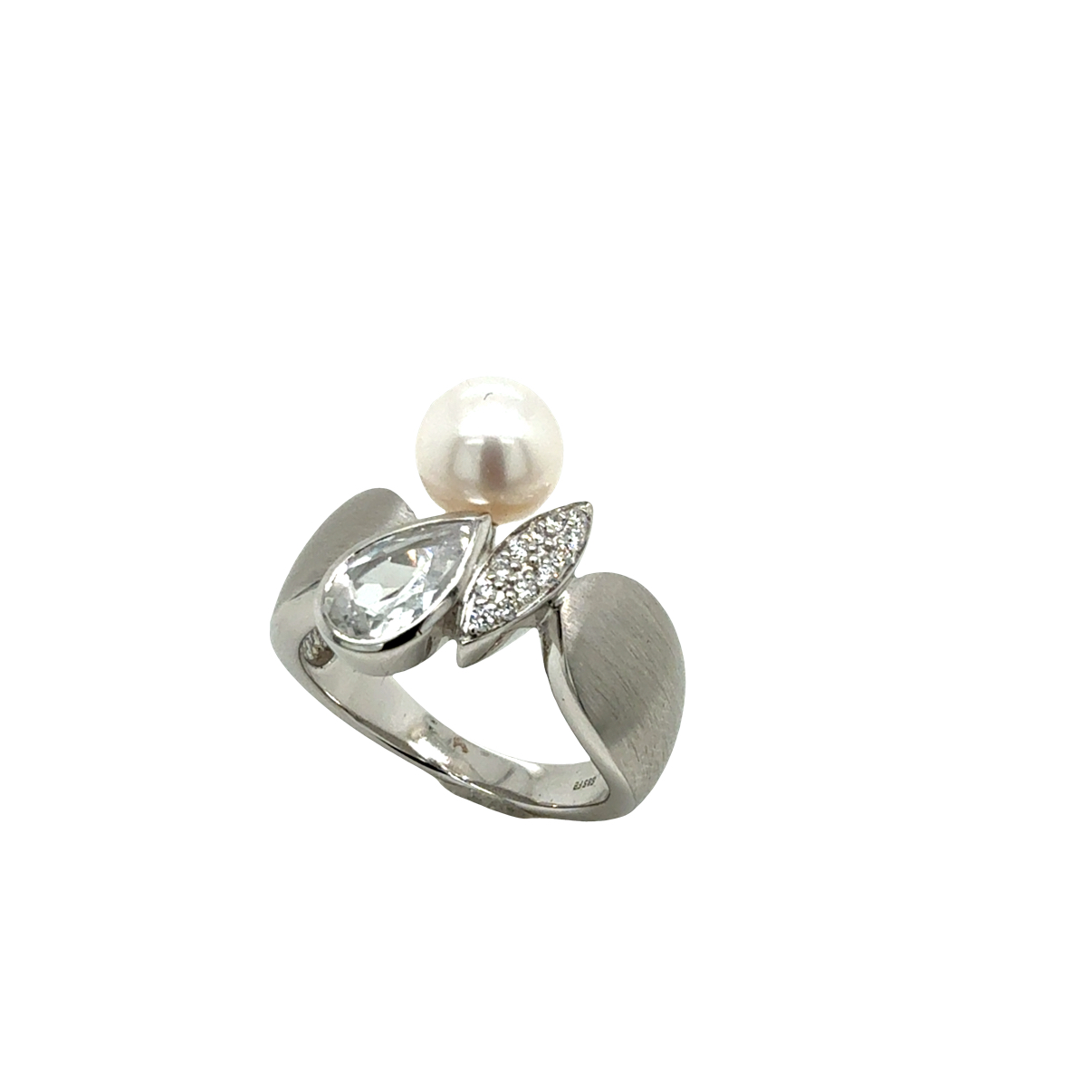 Das auffallende Schmuckstück besteht aus 14kt. Weißgold mit einem tropfenförmigen weißen Topas, einer weißen Süßwasserzuchtperle und funkelnden Diamanten. Das moderne Design wird Ihnen garantiert viele bewundernde Blicke bescheren.