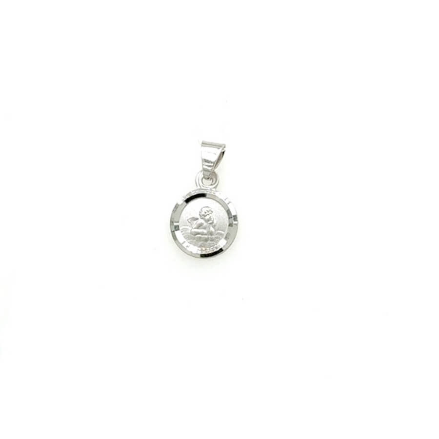Zarter, runder Anhänger mit kleinem Schutzengel in der Mitte und leicht erhöhtem Rand.
