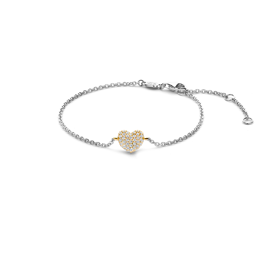 Dieses Armband zeigt ein zartes Herz, verziert mit handgesetztem Zirkonia-Pavé, das sorgfältig in einer strahlenden, goldplattierten Fassung gesetzt ist.