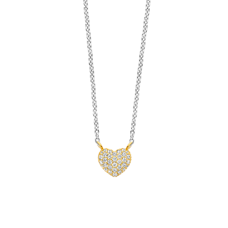 Dieses Collier zeigt ein zartes Herz, verziert mit handgesetztem Zirkonia-Pavé, das sorgfältig in einer strahlenden, goldplattierten Fassung gesetzt ist.